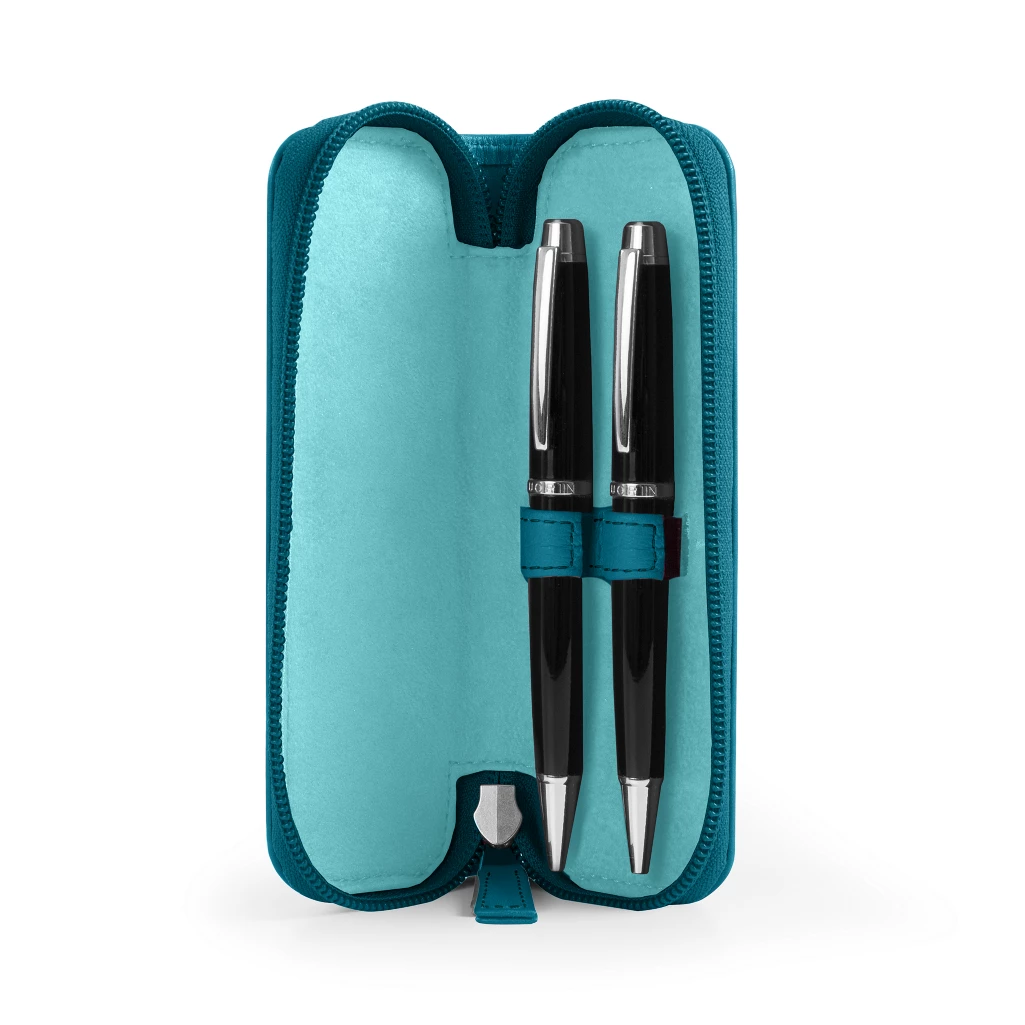 ペンを2本まで収納できる、ファスナー付きのエレガントなペンケースです。ペンホルダーは伸長性があるため、ペンの太さを問わずしっかりと収納できます。ペンは本製品に付属しません。