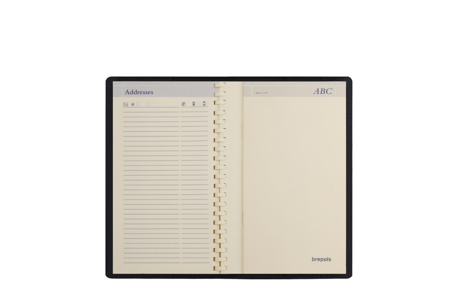 フルグレインレザーを使用した2019年版ポケットダイアリー。見開き1ページに一週間分の予定を書きこめるBrepols社の「OMNIPLAN」ダイアリー、電話帳、予定表、世界地図が付属します。ダイアリーは1月1日始まりです。