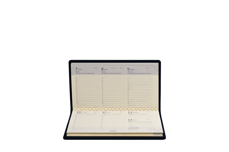 フルグレインレザーを使用した2019年版ポケットダイアリー。見開き1ページに一週間分の予定を書きこめるBrepols社の「OMNIPLAN」ダイアリー、電話帳、予定表、世界地図が付属します。ダイアリーは1月1日始まりです。