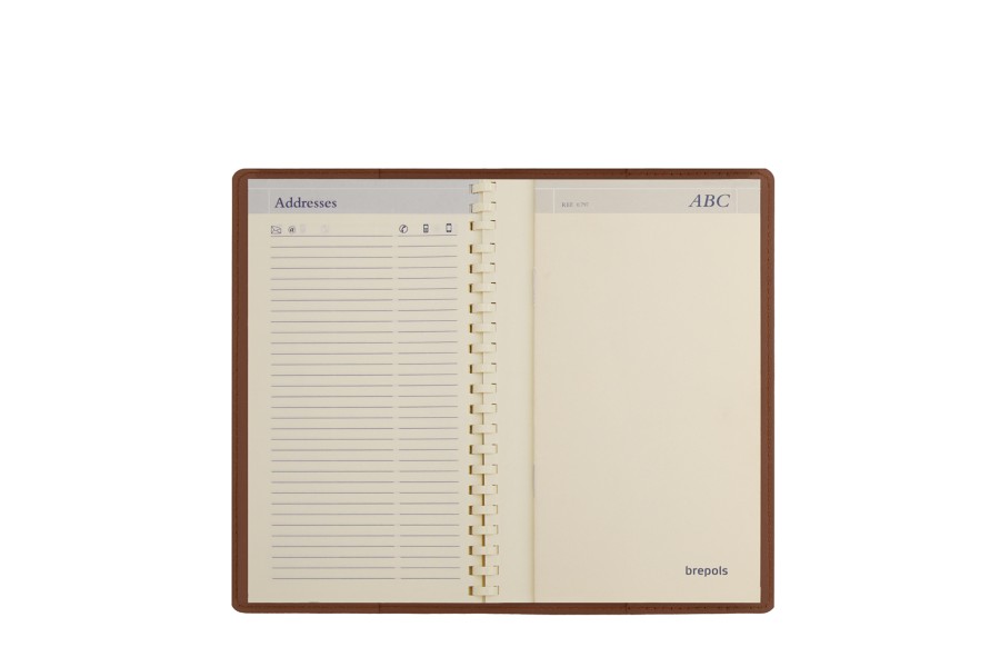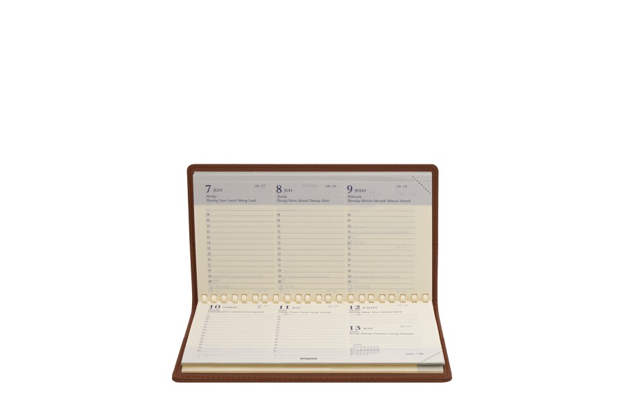 フルグレインレザーを使用した2019年版ポケットダイアリー。見開き1ページに一週間分の予定を書きこめるBrepols社の「OMNIPLAN」ダイアリー、電話帳、予定表、世界地図が付属します。ダイアリーは1月1日始まりです。