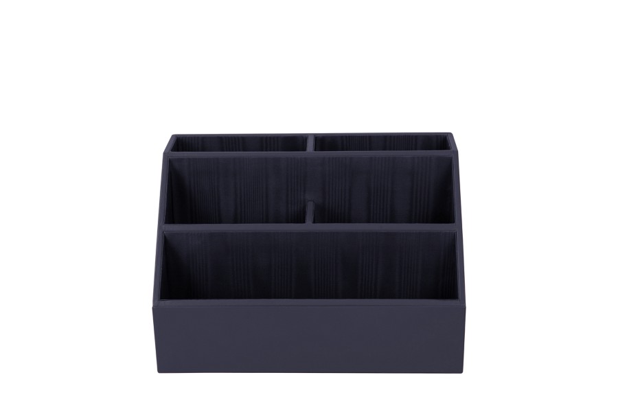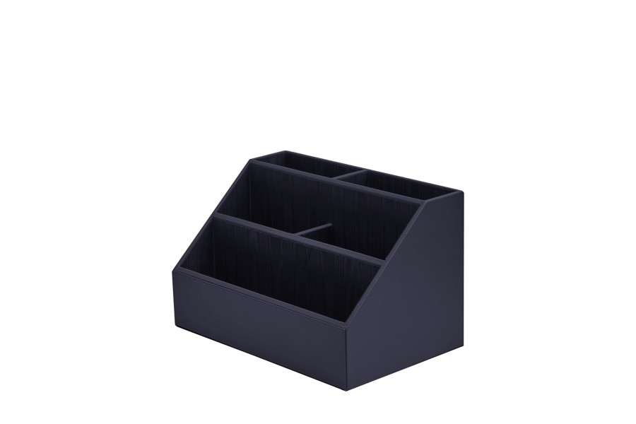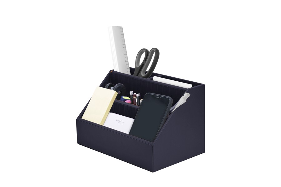 ホチキス、クリップ、ハサミ、定規、ペン、消しゴム...等々、机の上をすっきり整理するのにとても便利な収納です。木製の本革に覆われたこの商品は目的によってサイズの違う複数個の収納を組み合わせていますが、統一された素材とフォルムが見た目も美しくデスクを綺麗に保ってくれます。