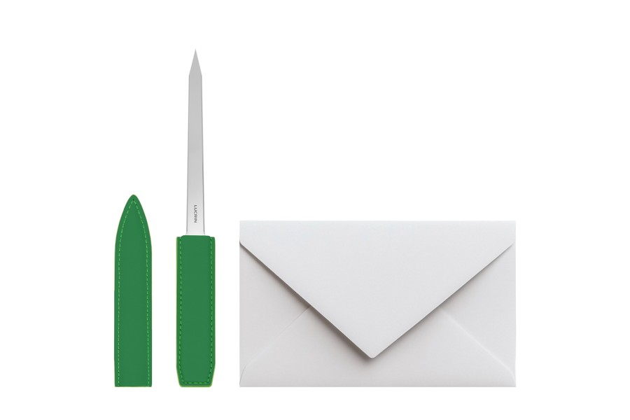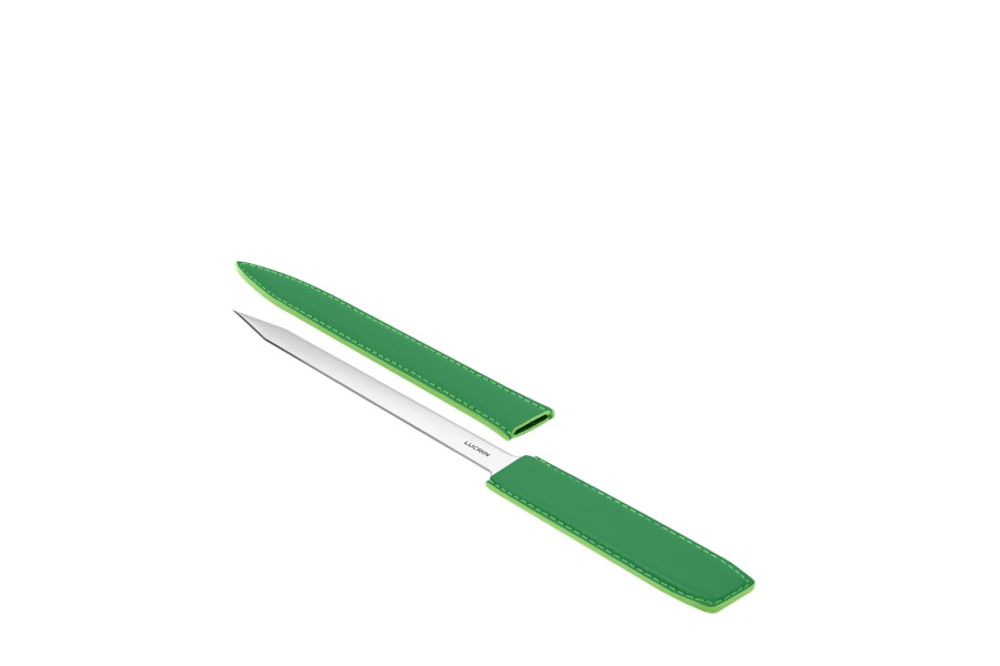 このレターオープナーは、エレガントさと実用性を見事に兼ね揃えており、美しい小物や雑貨コレクターのお眼鏡に叶うこと間違いなしの逸品です。シルバーの真鍮刃(13.6cm)によって、手軽かつ正確に封筒を開封することができます。使用後は剣のように、レザー製の鞘に収めて保管できるデザインになっています。ハンドル部分もレザー製であるため、使用時のグリップ感も良く、使いやすさも抜群です。