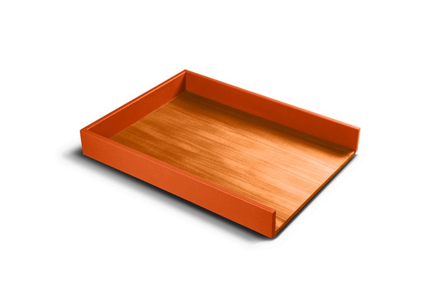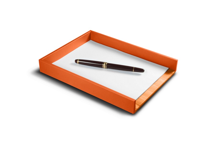 木製のレタートレー。高級レザーで覆われたトレーは見た目も美しく、重ね収納ができるのでデスクもすっきり整います。ぺーパーサイズ : 100x150 mm. サイズ : 18.5 x 23.6 cm 高さ : 4 cm