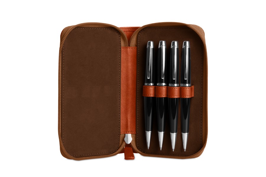 ペンを4本まで収納できる、ファスナー付きのエレガントなペンケースです。ペンホルダーは伸長性があるため、ペンの太さを問わずしっかりと収納できます。ペンの長さ:最長14.5 cmまで。