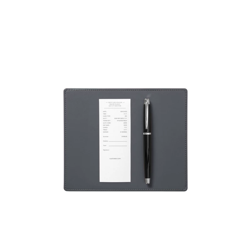 本革製のサイン用ライティングパッド。クレジットカードの領収書にサインを求める場面などで大活躍のアイテムです。支払窓口やレセプションにエレガントな趣を与えてくれます。下面には高級感のあるマイクロファイバー素材を使用しており、デリケートな表面も傷付けずにご使用いただくことができます。